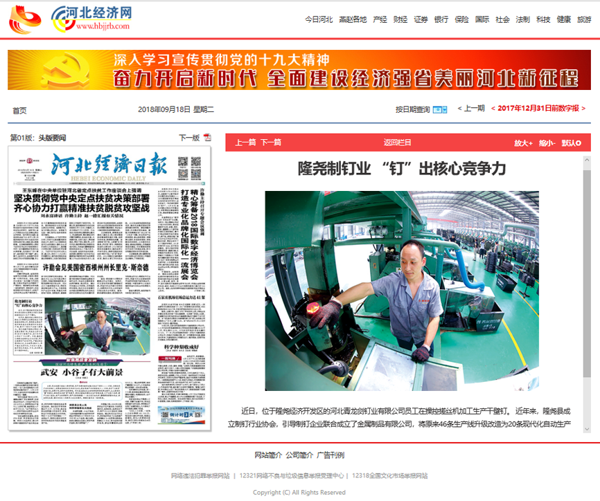 點贊!青龍劍釘業被《河北經濟日報》頭版要聞