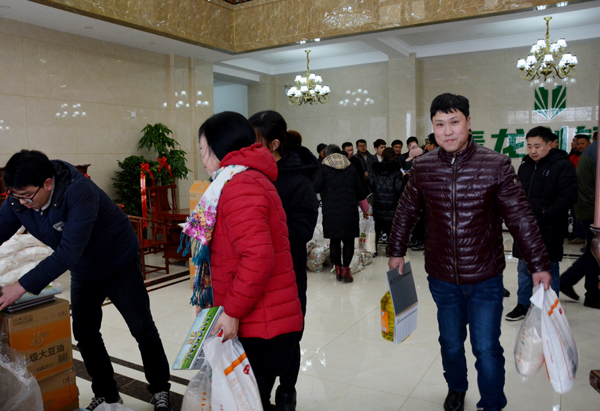 員工會議結(jié)束后,員工們領(lǐng)取公司為大家準備的福利。